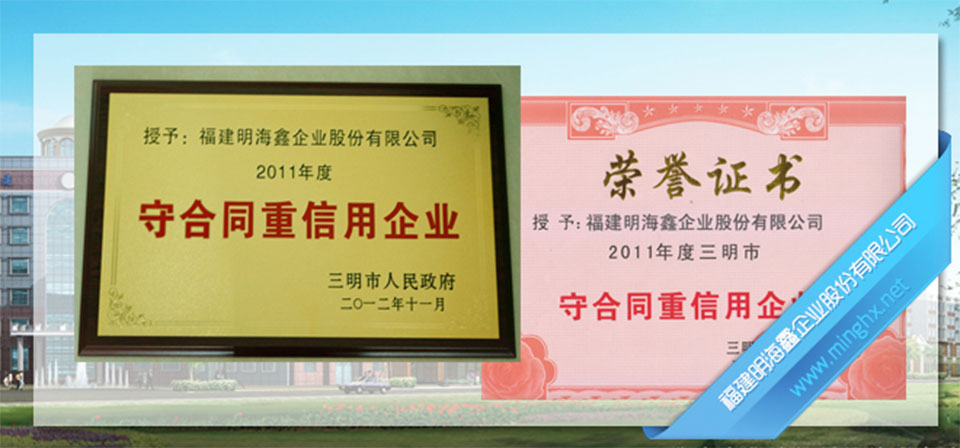 福建明海鑫企業(yè)股份有限公司被三明市人民政府授予:2011年度三明市守合同重信用企業(yè)。